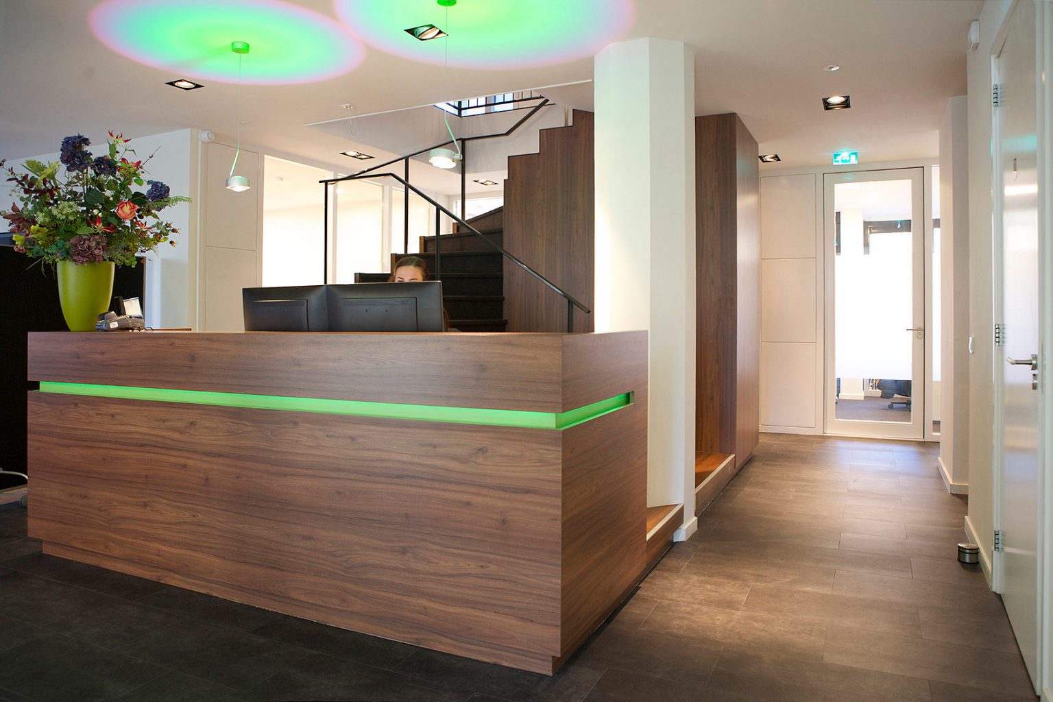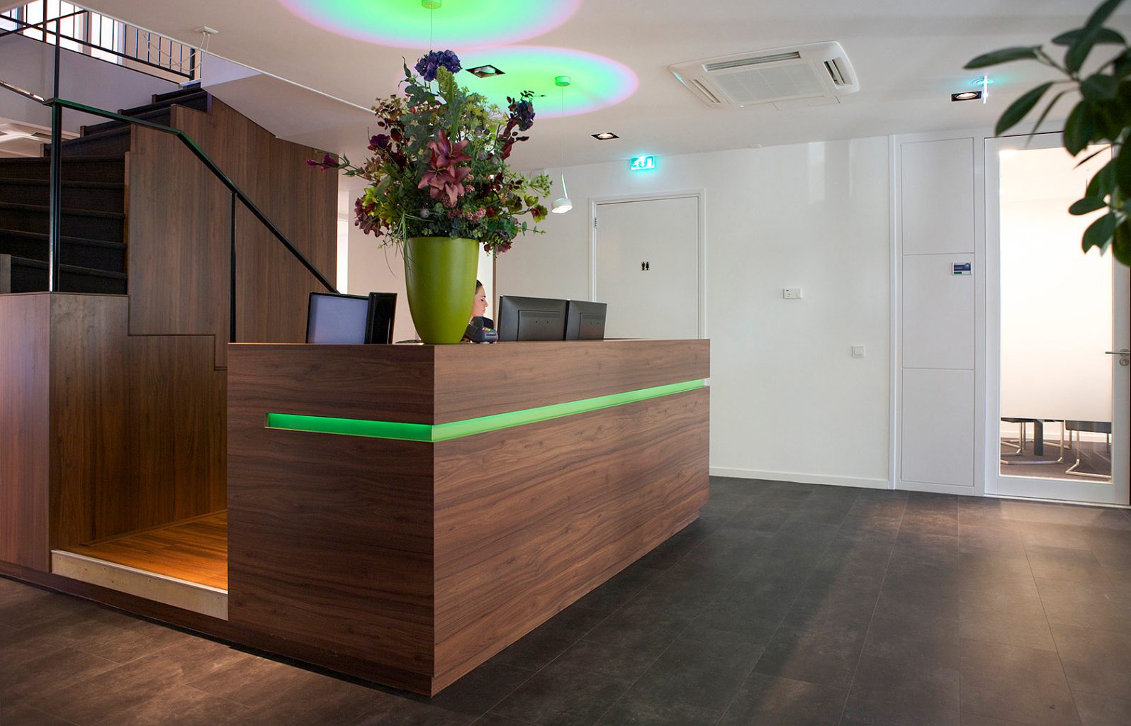 Een voormalig bankkantoor uit de jaren ’70 is gerenoveerd en geschikt gemaakt als bedrijfsverzamelgebouw. Alle kozijnen zijn vervangen en op de begane grond is een metselwerk plint gerealiseerd. De entrees zijn vernieuwd en er is een entree toegevoegd. Voor Hoge van Gerven Notarissen hebben we de inrichting mogen ontwerpen. Belangrijk element was het maken van een interne verbinding tussen de twee kantoorlagen. Een receptie- en trapmeubel maakt deze verbinding tussen de begane grond en de eerste verdieping mogelijk en verbindt en scheidt door zijn positie en vorm de verschillende ruimten.
