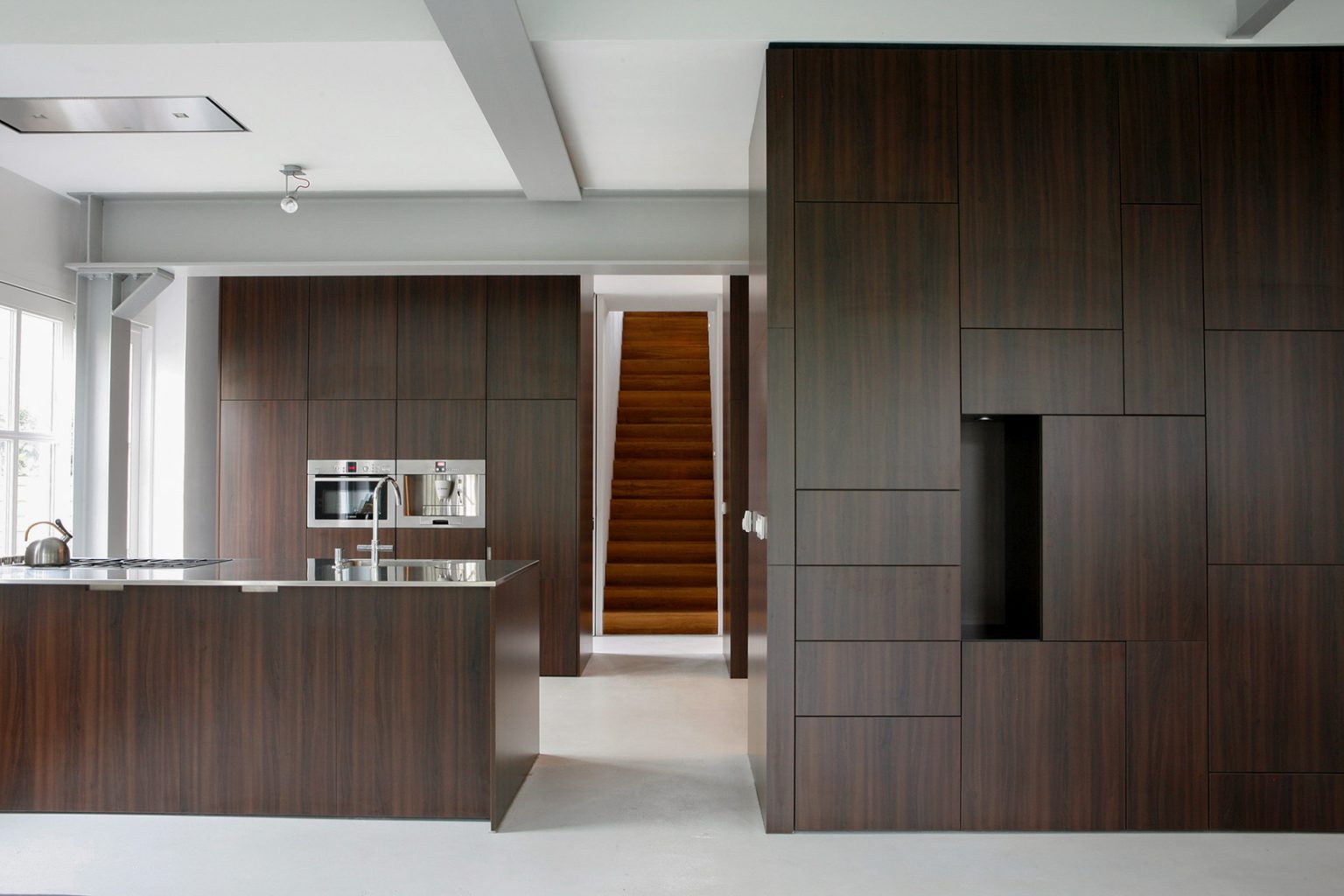 In de woning zijn de vroegere ingrepen herkenbaar gemaakt. De verlaagde plafonds zijn gesloopt en de tussenwanden verwijderd. De nieuwe indelingen zijn middels meubels vormgegeven waardoor de continuïteit van de ruimte gewaarborgd is. De plaats van de trap is gehandhaafd de trap vernieuwd. Op de verdieping is hierdoor ruimte voor een brede overloop die multifunctioneel inzetbaar is. Daarnaast biedt de zolder ruimte aan 3 slaapkamers, bergruimte, 2 badkamers en een toilet. De oorspronkelijke dakconstructie is gerestaureerd en in het zicht gelaten. De nieuwe dakplaten zijn hiervoor aan de buitenzijde aangebracht.